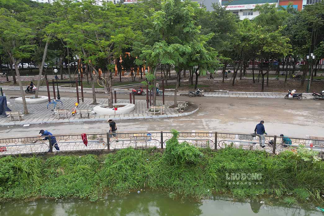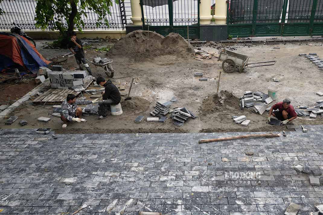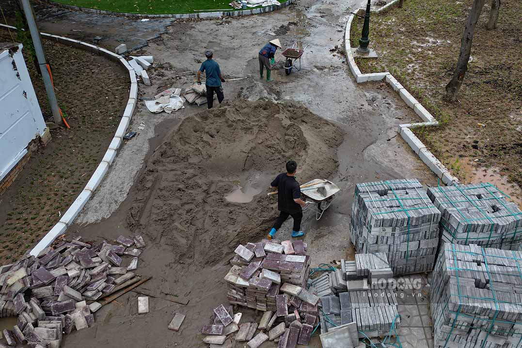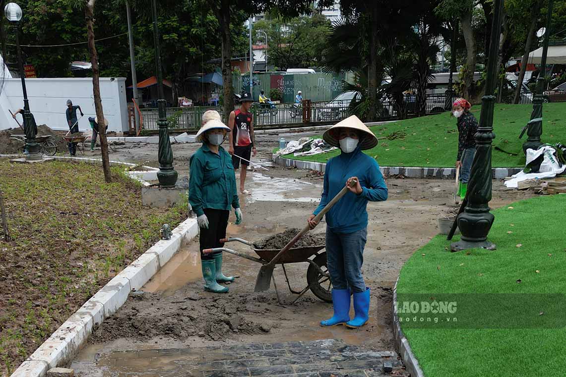 Hàng chục công nhân tiếp tục triển khai những hạng mục còn lại, bất chấp thời tiết nắng mưa thất thường. Kỹ sư Nguyễn Đức Lâm, tư vấn giám sát dự án, cho biết hiện Công viên Cầu Giấy đã hoàn thành khoảng 90% khối lượng công việc, hướng đến phục vụ người dân đúng dịp lễ 10.10.