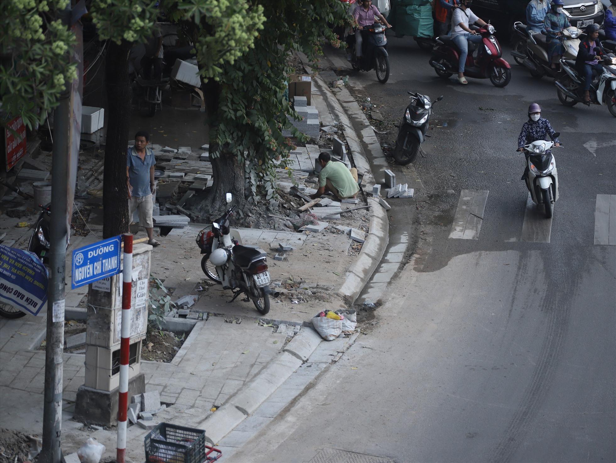"Công nhân nhiều hôm làm chỗ này một ít, rồi lại chuyển qua chỗ khác khiến vỉa hè rất nhếch nhác", anh Nguyễn Bá Vinh, có nhà mặt đường Nguyễn Chí Thanh, cho hay.