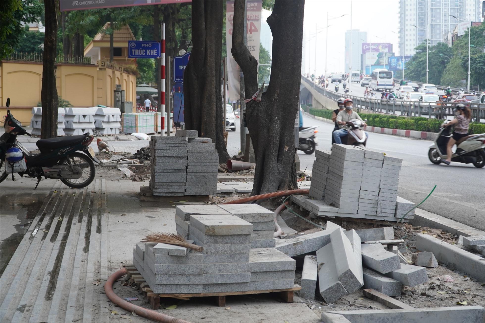 Còn những đoạn đã được lát đá xong thì bị bỏ lại vật liệu và chưa được hoàn trả vỉa hè như cũ.