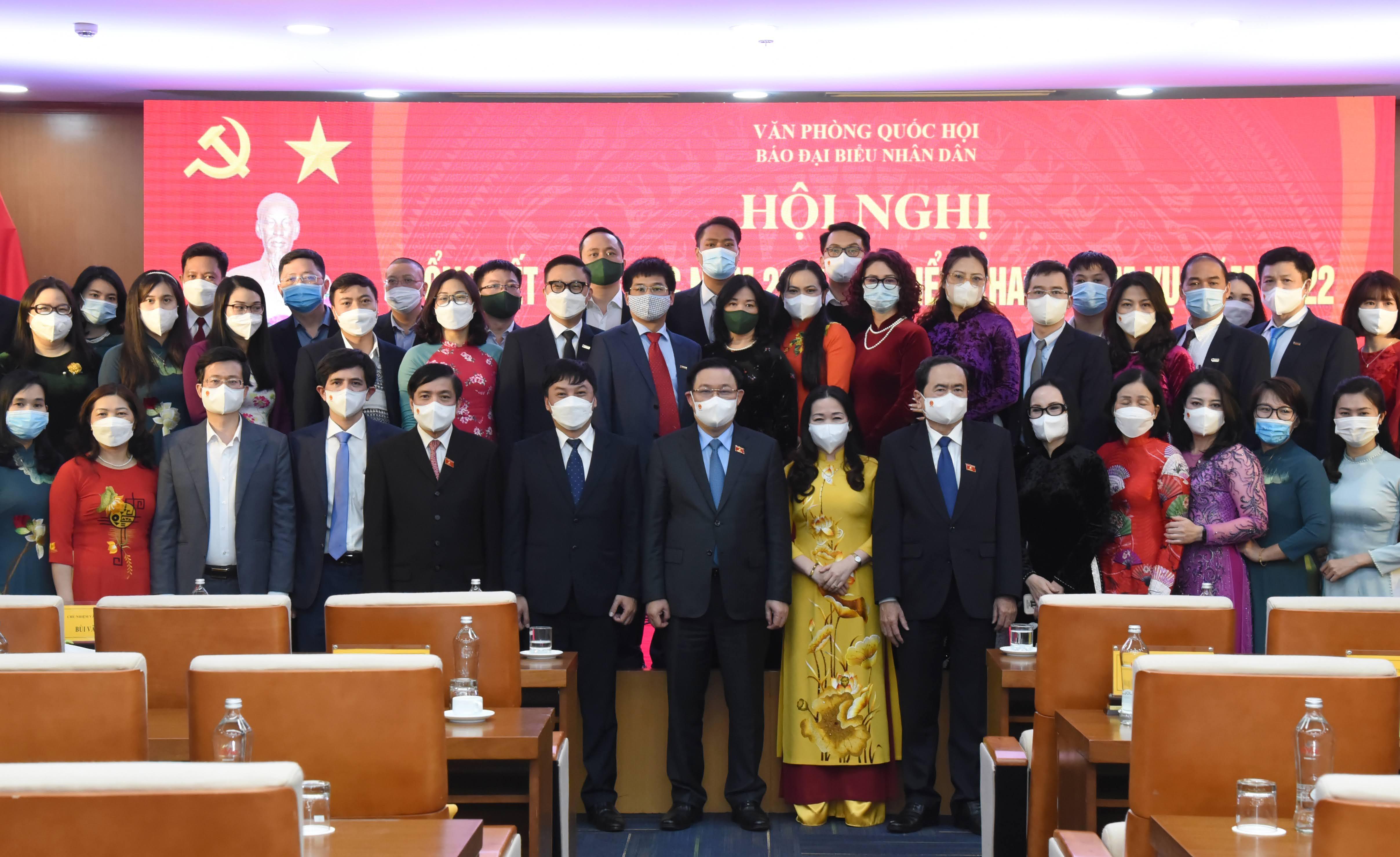 Chủ tịch Quốc hội Vương Đình Huệ, Phó Chủ tịch Thường trực Quốc hội Trần Thanh Mẫn và cán bộ, phóng viên, biên tập viên Báo Đại biểu Nhân dân. Ảnh: VGP |