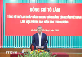 Chiều 5/3, tại Hà Nội, Tổng Bí thư Tô Lâm đã có buổi làm việc với Ủy ban Kiểm tra Trung ương về kết quả thực hiện nhiệm vụ tham mưu xây dựng, hoàn thiện thể chế chuẩn bị cho Hội nghị lần thứ hai Ban Chấp hành Trung ương Đảng khóa XIV.