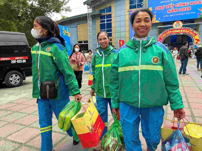 Người lao động phấn khởi đi Chợ Tết Công đoàn do LĐLĐ Thành phố Hà Nội tổ chức. Ảnh: Kiều Vũ