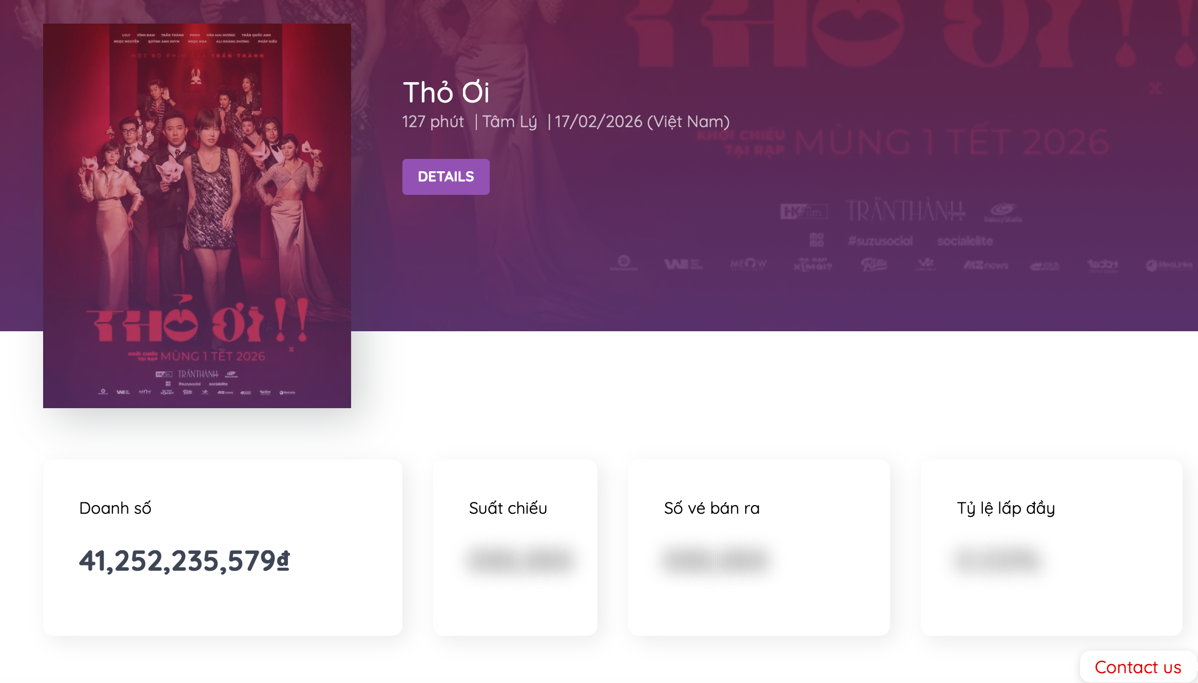 Theo Box Office Vietnam, phim "Thỏ ơi!!" của Trấn Thành đạt tổng doanh thu hơn 41 tỷ đồng. Riêng trong ngày 17/2 (mùng 1 Tết Nguyên đán 2026), dự án của Trấn Thành thu về hơn 25 tỷ đồng với hơn 246.000 vé được bán ra trên hơn 3.800 suất chiếu.