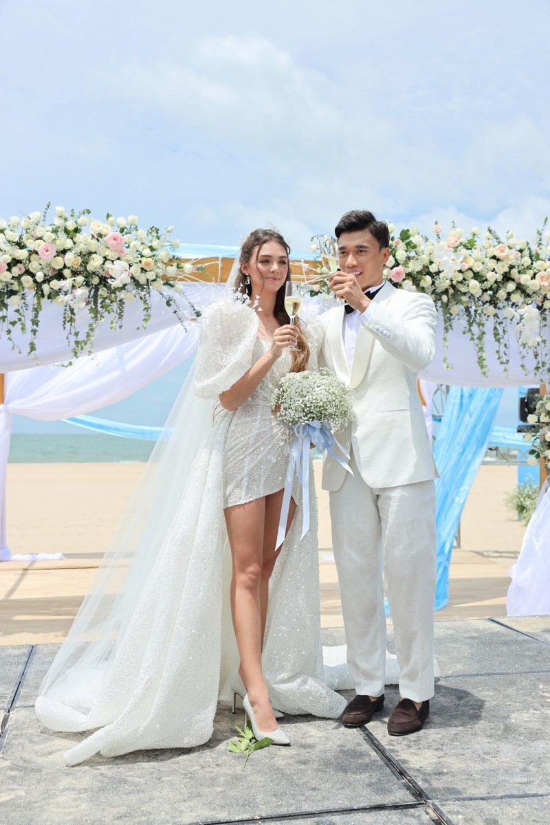 Trong những hình ảnh đăng tải lên MXH, cô dâu Dianka Zakhidova và chú rể Tiến Dũng rất đẹp đôi sánh bước bên nhau. Cô dâu diện mẫu váy cưới phá cách giúp Dianka khoe trọn đôi chân dài 1,12m của mình. Theo đó, chiếc váy cưới này có 30.000 viên đá swarovski và đá thủy tinh được đính tay.