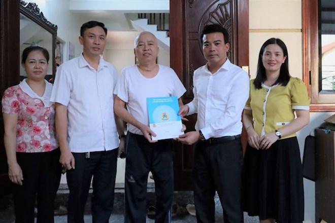 Ông Lê Quang Toản - Chủ tịch LĐLĐ tỉnh Hưng Yên trao quà cho đoàn viên khó khăn. Ảnh: CĐHY