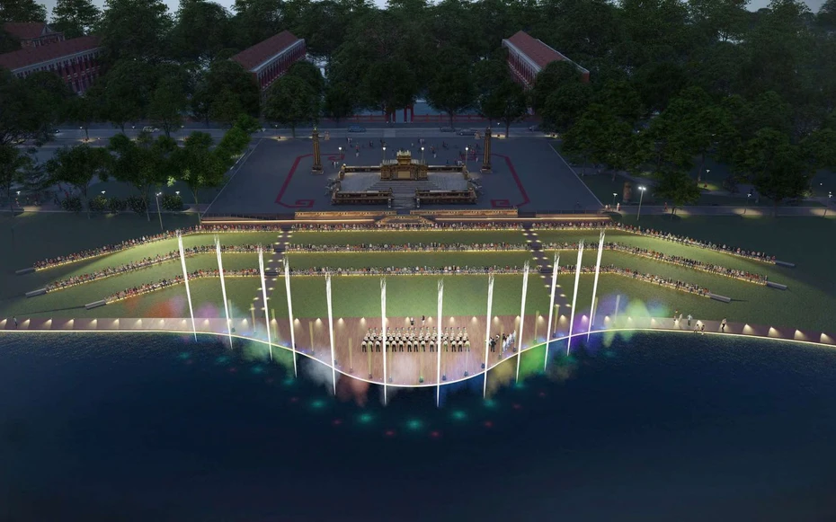 Theo phương án mới, TP Huế quyết định xây dựng một sân khấu nằm trên mặt nước sông Hương, lấy cảm hứng từ hình kim khánh triều Nguyễn.