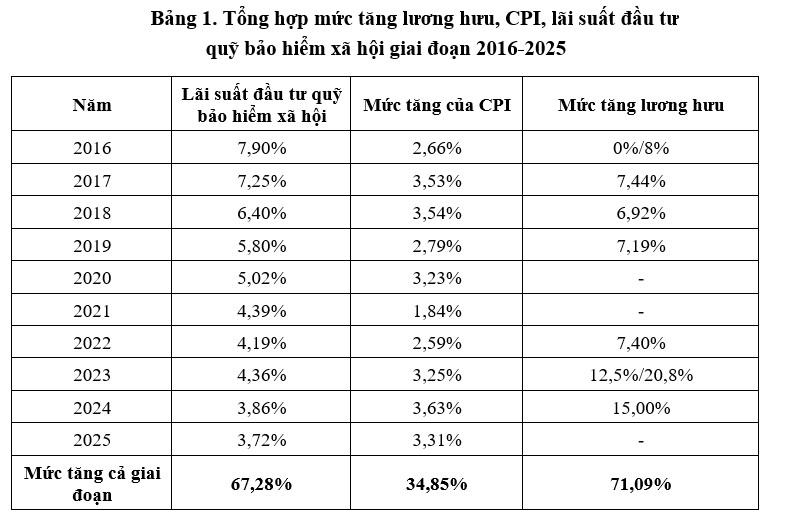 Tính trong giai đoạn 2016-2025: mức tăng lương hưu là 71,09%; mức tăng của CPI là 34,85%; lãi suất đầu tư quỹ bảo hiểm xã hội là 67,28%.