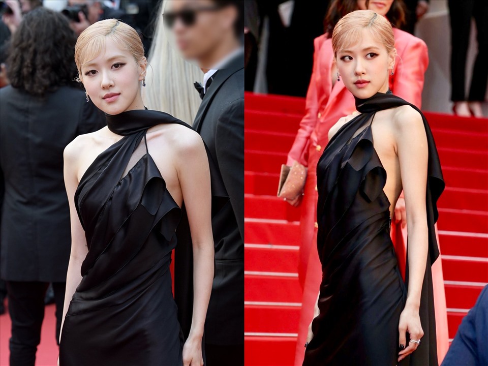Ở thảm đỏ Liên hoan phim Cannes, Rosé mặc chiếc váy lụa đen ôm sát có thiết kế cổ yếm trang nhã, sang trọng.