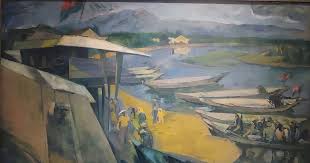 Sắc màu của hòa bình được họa sĩ thể hiện thật tinh tế, sâu lắng nơi bến sông Hiếu (Đông Hà) có những con đò vừa thảnh thơi nghỉ chuyến vừa thong thả đón dòng người đến - đi…
