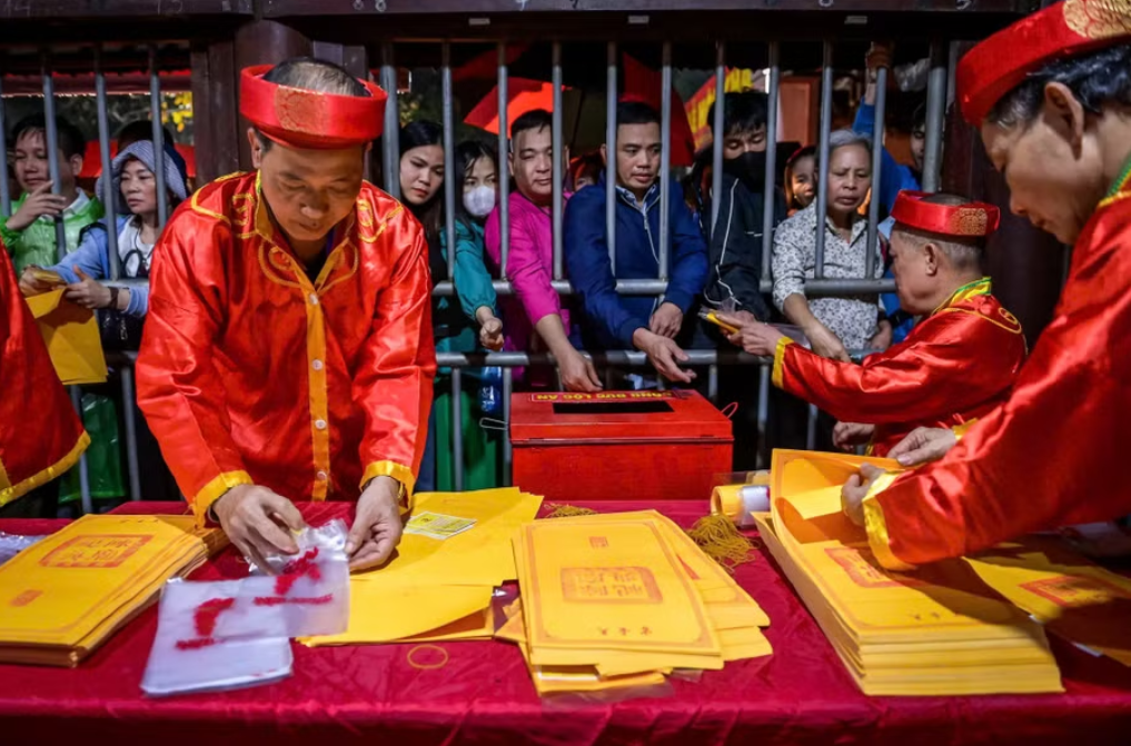 | Du khách nhận ấn sau lễ khai ấn, gửi gắm ước mong một năm mới thuận lợi, hanh thông và nhiều thành tựu. |