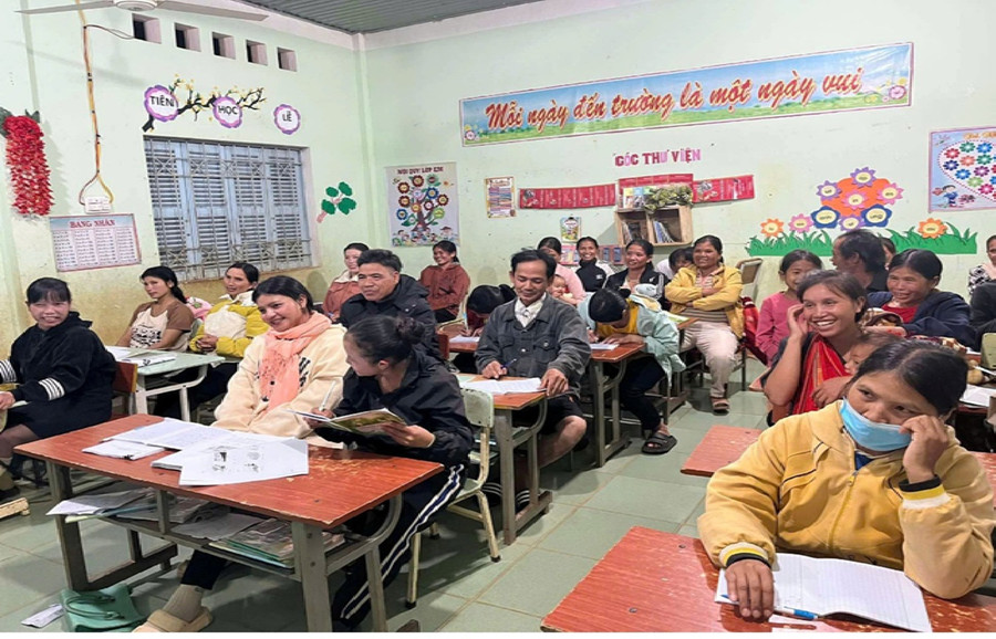 Lớp học xóa mù chữ do cô Luyện Thị Vinh giảng dạy.